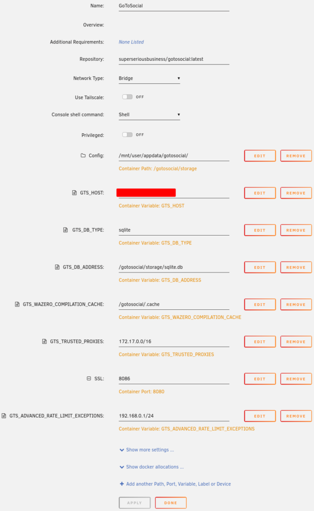 GTS_ADVANCED_RATE_LIMIT_EXCEPTIONS: This one was a little bit tricky to figure out, since that’s not even the standard ip range for my network. Eventually I found a helpful write-up in the GoToSocial documentation (https://docs.gotosocial.org/en/latest/configuration/trusted_proxies/) which let me identify what the issue was and how to address it.
